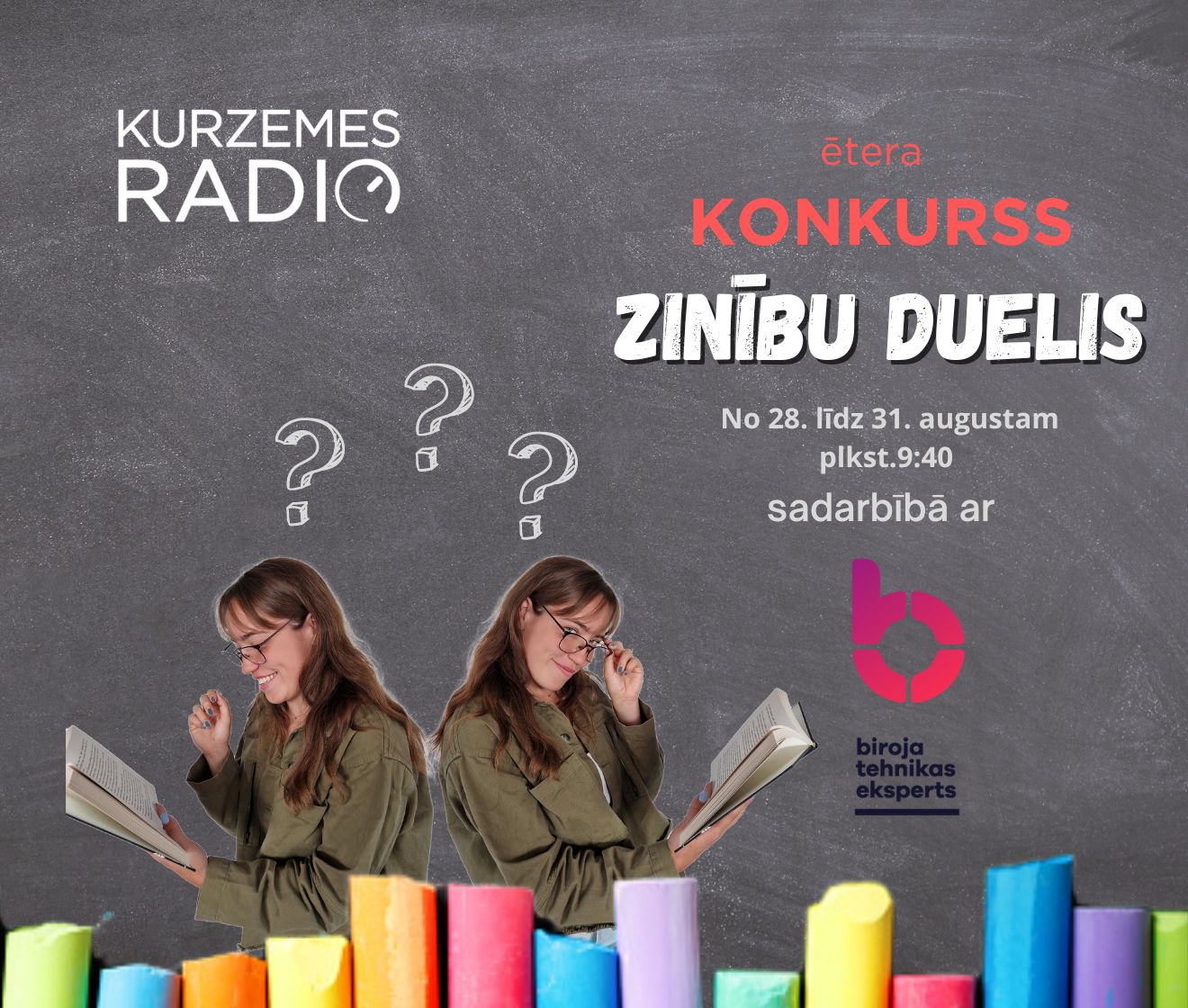 - No 28. līdz 31. augustam, plkst. 9:40 pieslēdzies mūsu Zoom saitei https://ej.uz/zinību-duelis,
