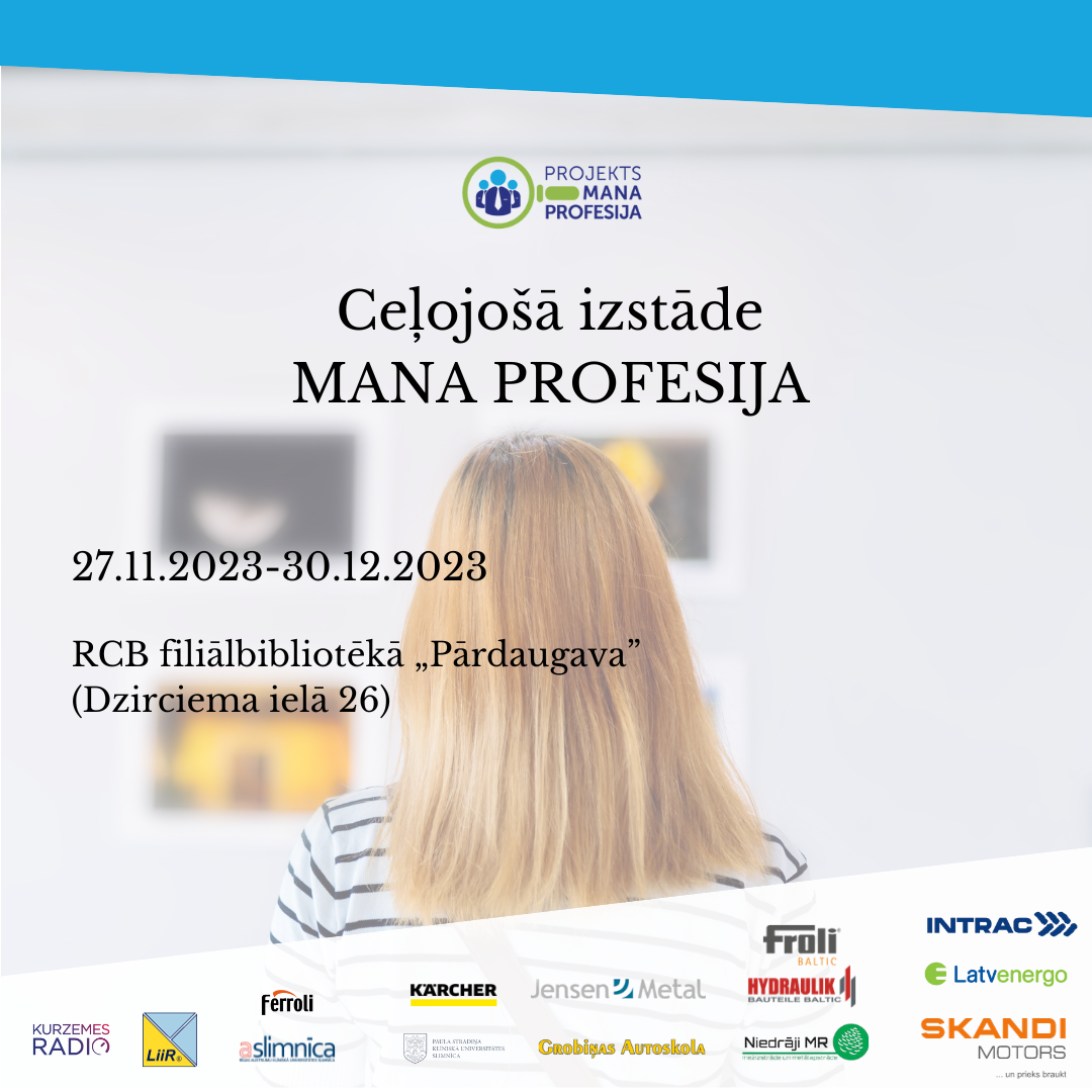 No 27. novembra līdz 30. decembrim Rīgas Centrālās bibliotēkas (RCB) filiālē „Pārdaugava” (Dzirciema ielā 26) apskatāma izstāde “Mana profesija”. Tajā iekļauti 1.–12. klašu skolēnu radošie darbi, kā arī informācija par uzņēmumiem, kas atbalsta projekta īstenošanu.